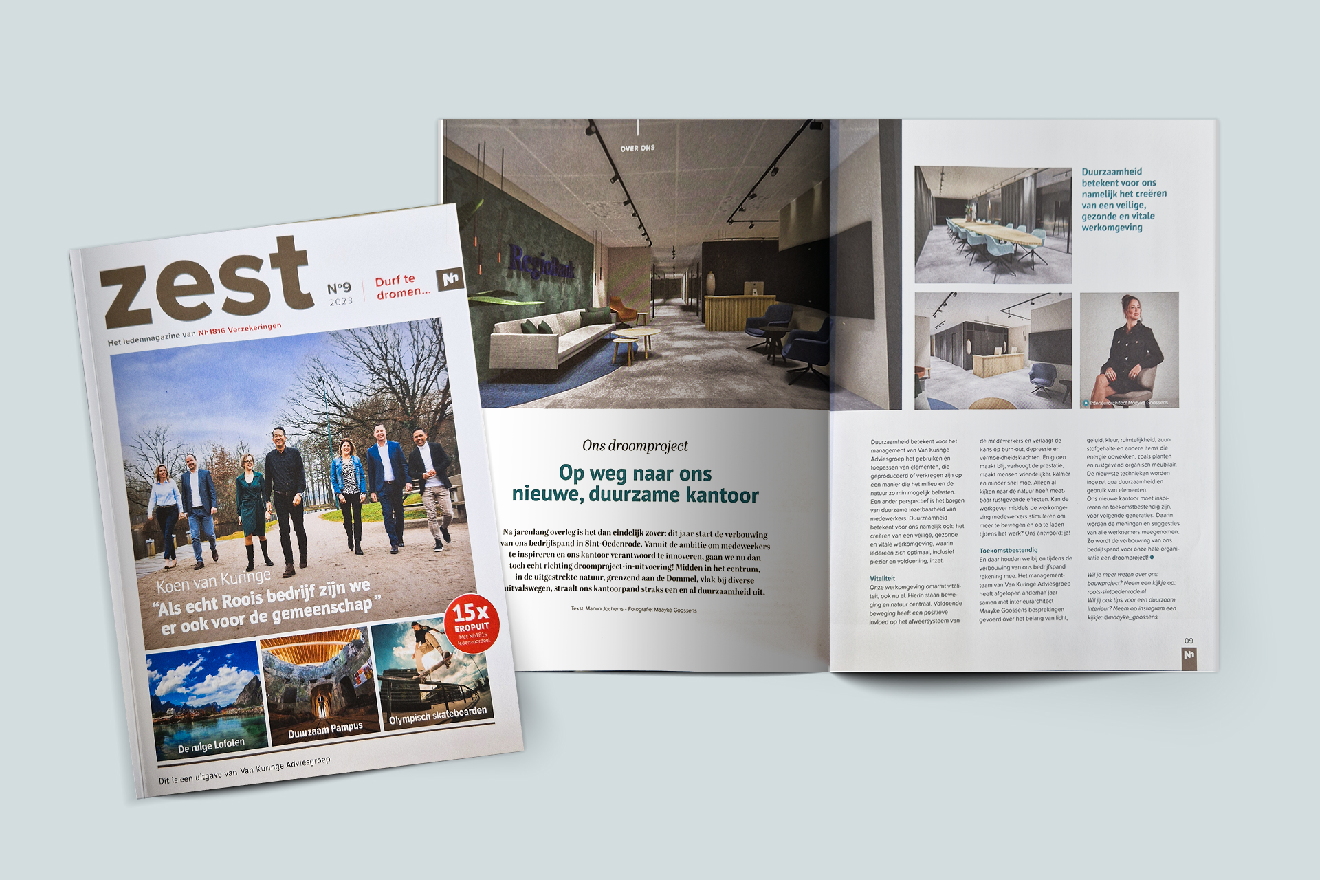 Zest is een magazine voor leden van Nh1816. Nh1816 is een verzekeraar van particuliere verzekeringen. Wij als financieel adviseur maken samen met hen jaarlijks ons eigen editie. Dit jaar was het thema ‘Dromen’. Het magazine is gemaakt in samenwerking met Joost de Vaan (gezondheidscentrum De Meierij), Teun van Acht (Van Acht Campers), Iris Vereijken (Roxxi), Maayke Goossens (Studio Maayke Goossens) en BTTS Studios.